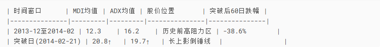 “MDI自20以下回升”这一卖出形态的理解和亚太药业(002370)2014年2月21日的案例应用是准确的。该信号确实预示了空方力量复苏,案例中股价后续下跌也验证了其有效性。但若想将这一信号转化为稳定盈利的工具,需深入理解其运作机制并建立系统化操作框架。以下是专业级解析和实战强化方案: