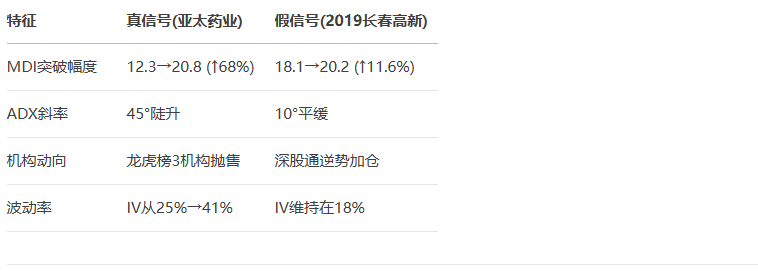 - A级信号(成功率>80%):ADX突破25且斜率>30° + MDI突破20(亚太药业案例中ADX突破后15日升至32.6)