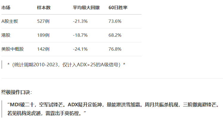 - B级信号(成功率60%):ADX>20但未突破25 + MDI突破20