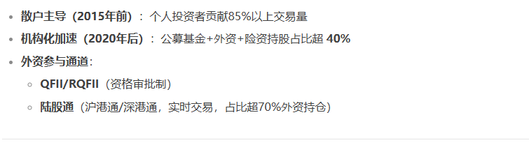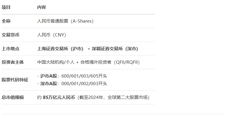 A股是中国股市的核心组成部分,指在中国内地注册、内地上市,以人民币标明面值、人民币交易的普通股票,由中国境内机构和个人直接参与(QFII/RQFII机制下外资也可投资)。以下是系统解析: