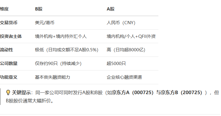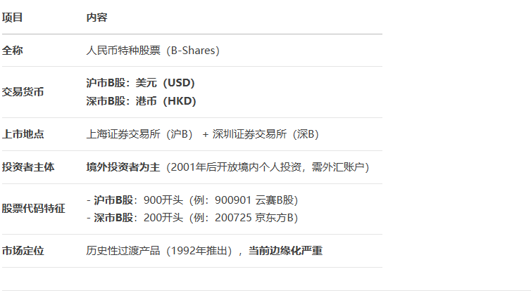 B股 是中国资本市场中一类特殊股票,正式名称为 人民币特种股票 ,其核心特征是 面向境外投资者、以外币交易 ,与A股形成互补。以下是关键解析: 一、基础信息速览 二、B股与A股