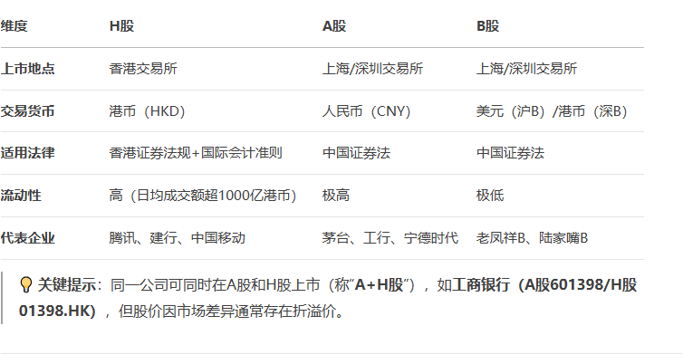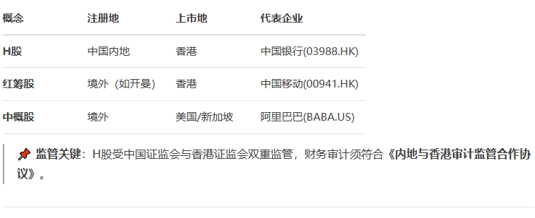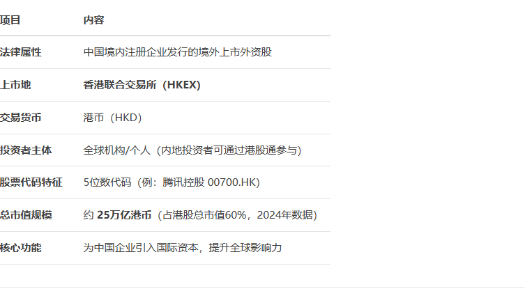 H股 是中国企业海外上市的核心载体,指 在中国内地注册、在香港联合交易所(HKEX)上市 ,以 港币(HKD)计价交易 的股票,面向全球投资者。其名称中的“H”即代表 Hong Kong(香港)