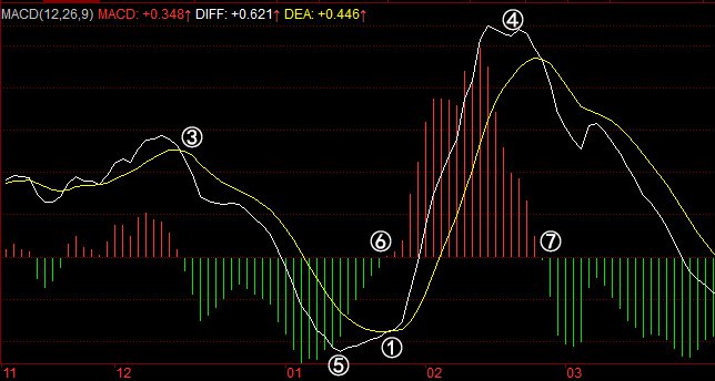 绿柱抽脚:下跌中绿柱突然缩短 → 反弹信号(如图位置⑥)