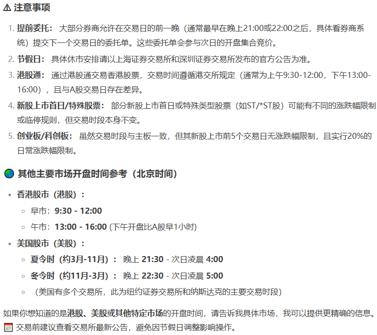 中国股市的开盘时间(股票开市时间)主要指的是 上海证券交易所(沪市) 和 深圳证券交易所(深市) 的交易时间。 以下是 A股市场 的标准交易时间安排: