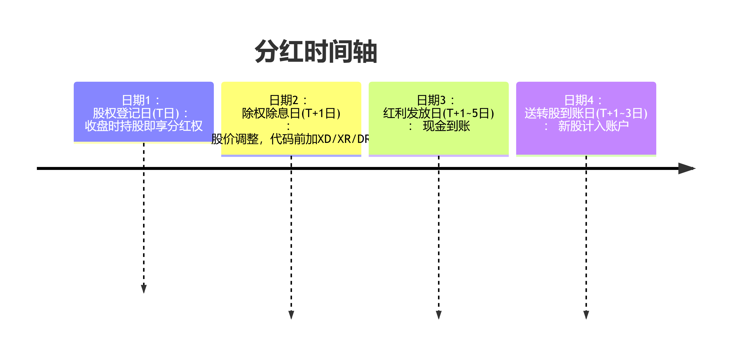 | 股价调整 | 除息(XD),股价下降对应现金额 | 除权(XR),股价按比例下调 |
