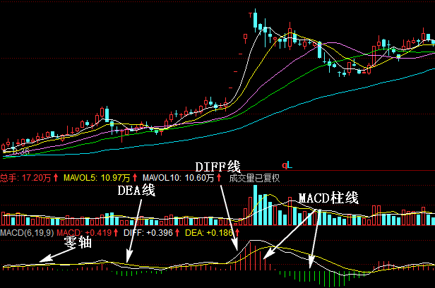 MACD指标是由DIFF线、DEA线、MACD柱线和零轴这“三线一轴”组成。投资者就是通过这“三线一轴”的交叉、背离、突破、支撑与阻碍等方式来对股价进行研判。