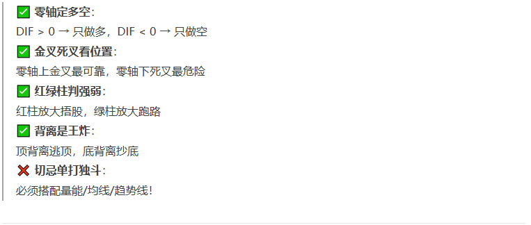| 震荡市失效 | 零轴附近频繁金叉死叉 | 改用布林带通道过滤信号 |