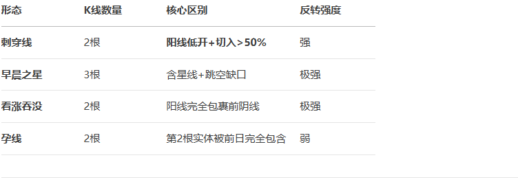 - 核心特征:由两根K线组成的看涨反转形态,出现在 下降趋势末端。