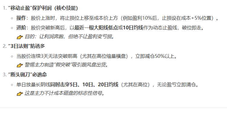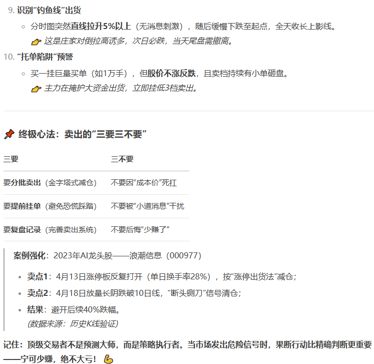 “会买是徒弟,会卖是师傅” 。在股市中,买入只是开始,能否成功 锁定利润、避免套牢 才是真正的考验。下面我结合实战经验,提炼出10条直击要害的卖出与出货技巧,助您摆脱“