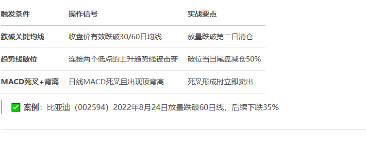 股票卖出的 七大核心策略 ,融合技术分析、基本面监控与交易纪律,助您系统化规避风险、锁定利润。每个策略均附带具体触发条件和操作细则: 一、趋势破坏卖出法(技术派首选)