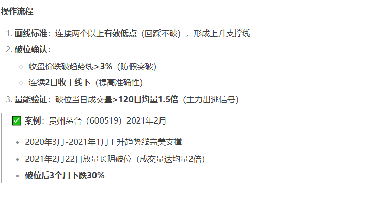 利用 趋势线判断卖出时机 是技术分析中的核心战术,关键在于识别趋势破坏的确认信号。以下是经过实战验证的 四步操作体系 ,配合量化标准和案例解析: 一、上升趋势线破位卖出