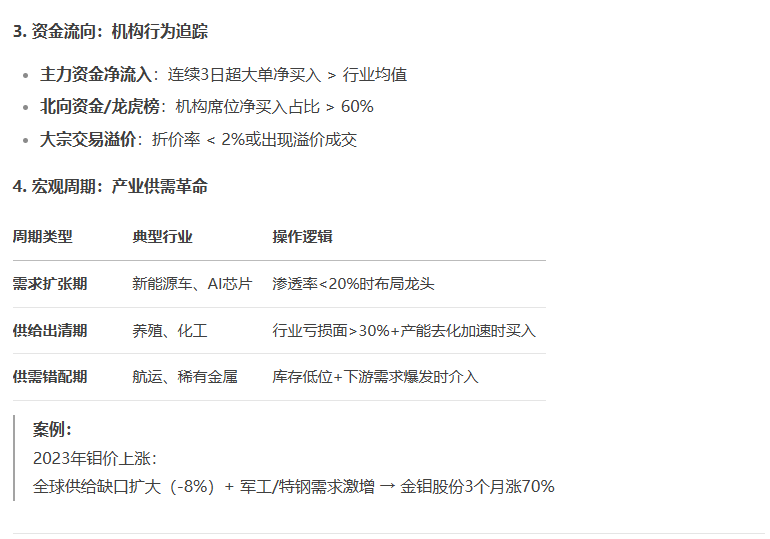 - 1.需求端爆发:行业景气度上行(营收增速 > 20%)政策催化(如新能源补贴加码)