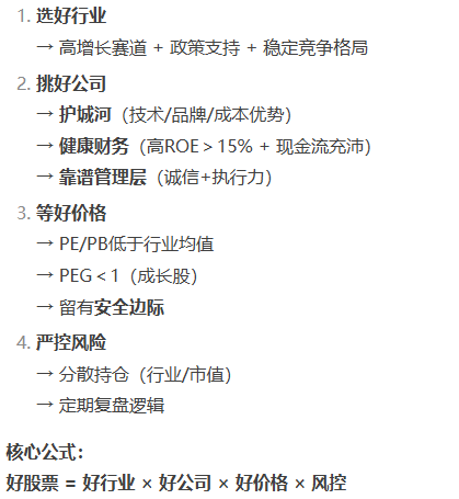 - 好公司是根本: 寻找拥有宽阔且持久的护城河、优秀的管理层、健康财务(尤其现金流)、持续增长潜力的公司。